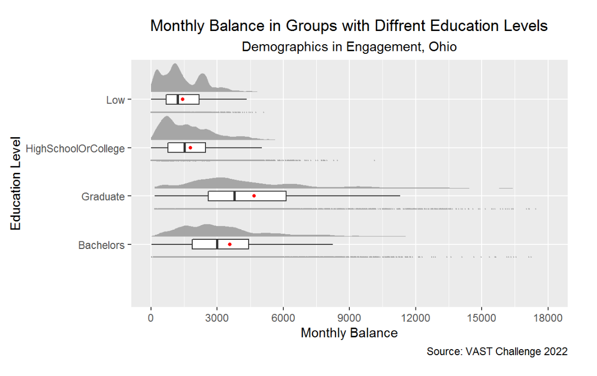 People’s spend and earning pattern may vary from different interest group, education level , age group and joviality level. There are many graph can help to understand better of these patterns, for example, scatter plot to show the distribution of residents’ expense and income in different age. We need to try multiple tables to see which one can give us a better result.