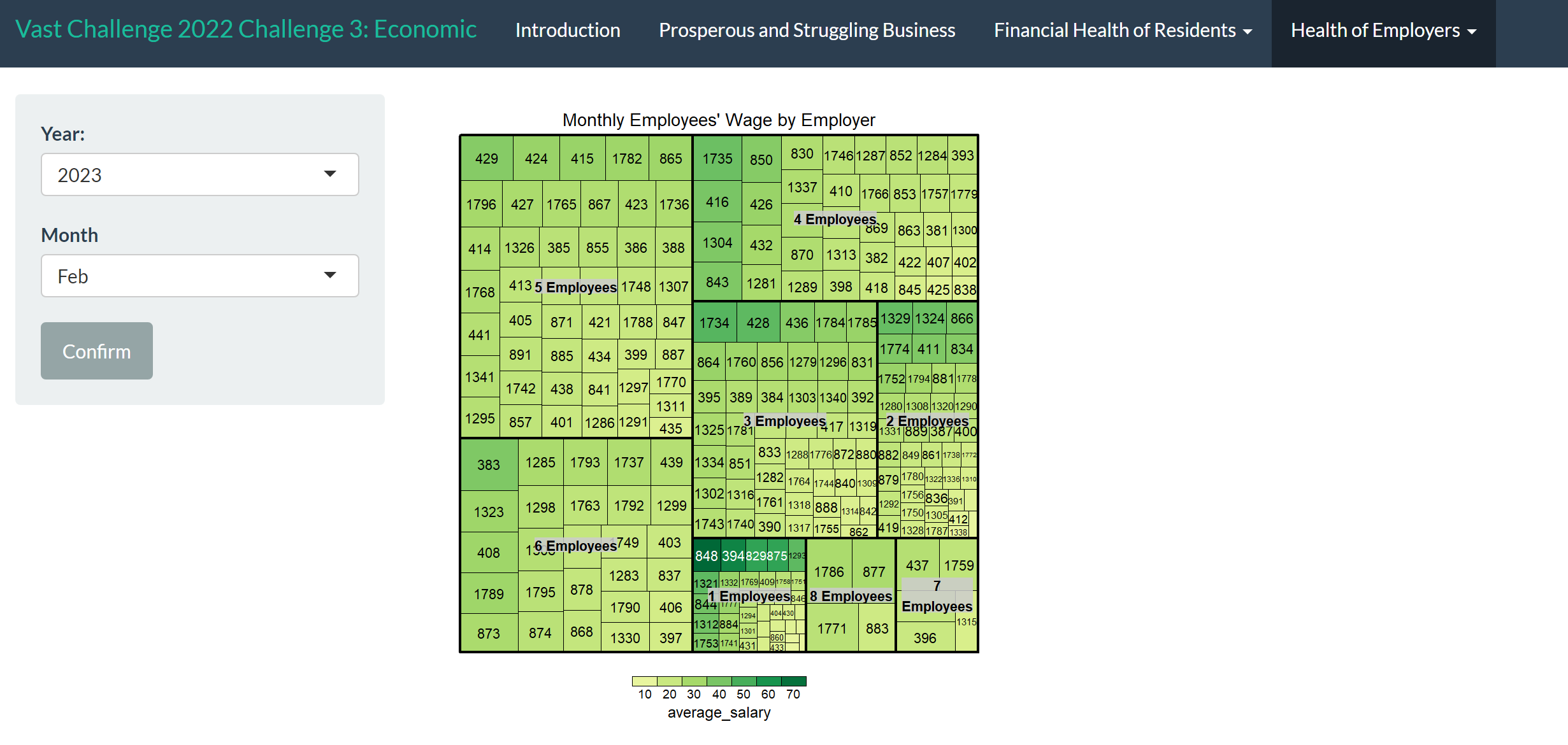 To know the health of the various employers, we need to know different employers’ employee size, which can be represented by the shape in tree map; we need to know the salary level of each employer, which can be represented by the shade of the tree map.